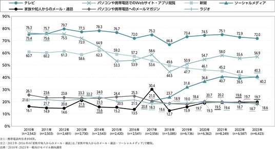 ※出典:NTTドコモ モバイル社会研究所『モバイル社会白書2023年版』「[資料2-15] 週1回以上アクセスし、ニュース(報道情報)を日常的に得ているメディアの年次推移(複数回答)」https://www.moba-ken.jp/whitepaper/wp23/chap2.html