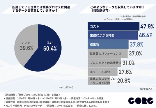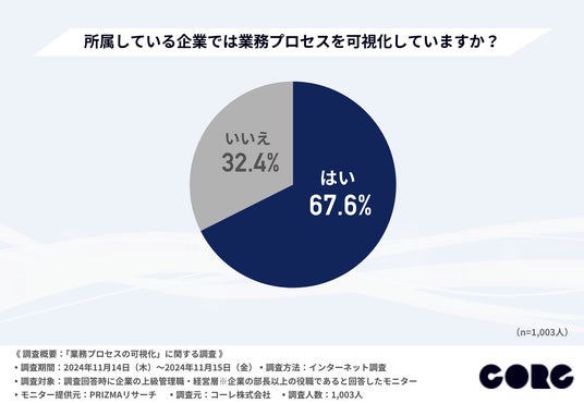 AIとビジネスをつなぐAIコネクティブカンパニーのコーレ株式会社(本社:東京都新宿区、代表取締役:奥脇 真人)は、企業の上級管理職と経営層の約1,000名を対象に「業務プロセスの可視化」に関する調査を行いました。企業の業務プロセスを可視化することは、生産性の向上やコストの削減などに影響を及ぼします。