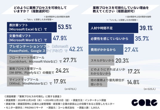 約7割の企業が業務プロセスを可視化しており、約半数の企業が表計算ソフトや文書作成ソフトなどを使用して可視化していることが示されました。
