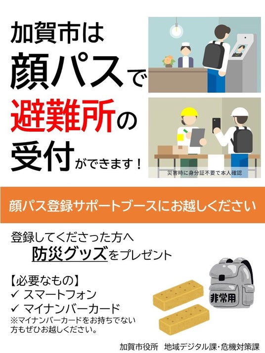 石川県加賀市(市長:宮元陸)では、2024年3月18日(月)から顔認証及びマイナンバーカードで受付できる避難所の運用を開始しております。スマホで初期登録さえすれば、「手ぶら」で避難した場合においても身元確認が可能であり、これは「マイナンバーカードにて公的個人認証を行った顔情報での受付」として全国初となります(2024年3月、加賀市調べ)。
