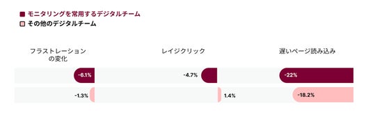 来訪者のデジタル顧客体験を常にモニタリングしているチームと、そうでないチームのそれぞれが運用するウェブサイトで、フラストレーションの主な指標が対前年比でどの程度変化したかを調査した。その結果、モニタリングを常用しているチームのほうがユーザーのイライラ体験を大幅に軽減できていることが明らかになった。