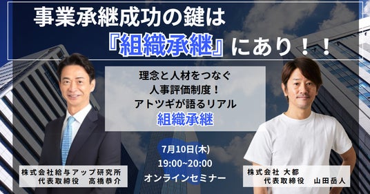 『事業承継成功の鍵は”組織承継”にあり!!理念と人材をつなぐ人事評価制度─アトツギが語るリアル組織承継』を2025年7月10日(木)19:00より開催いたします。