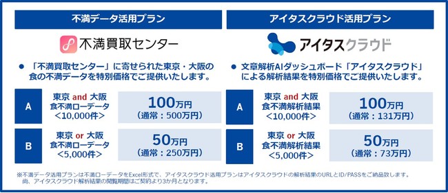 本レポートで利用した『不満買取センター』のデータと文章解析AIダッシュボード『アイタスクラウド』によるデータ解析結果を、特別価格でご提供いたします。ぜひこの機会にご活用ください。