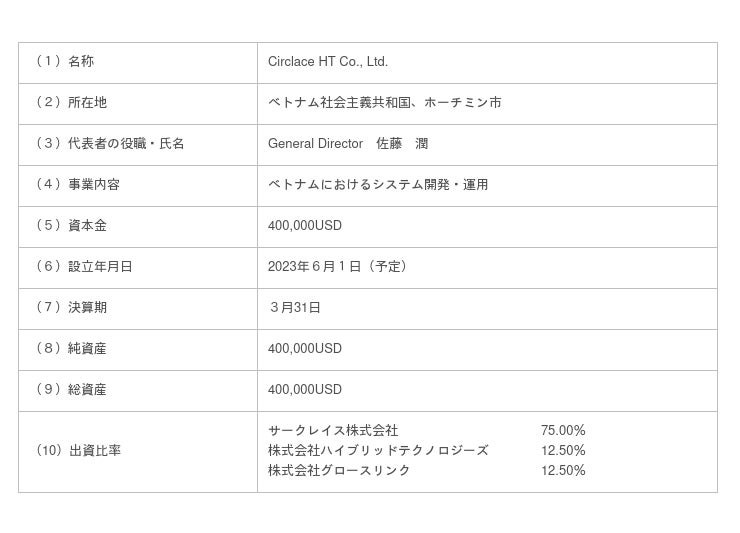当社は、2023年4月13日の取締役会において、サークレイス株式会社(以下、サークレイス社)及び株式会社グロースリンク(以下、グロースリンク社)との間で、顧客向けSalesforceプラットフォーム関連開発のグローバル展開と、100名以上のSalesforceエンジニアを擁する体制の構築を目的としたベトナム合弁会社を2023年6月に設立することを視野に入れ、基本合意することを決議しましたのでお知らせいたします。