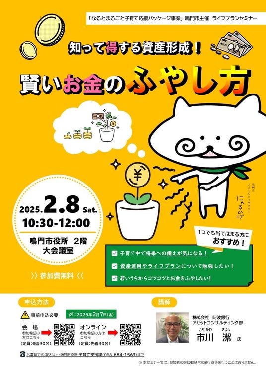 鳴門市役所子育て世代の悩みの1つである、将来に備える資産形成について学べる無料セミナーを開催
