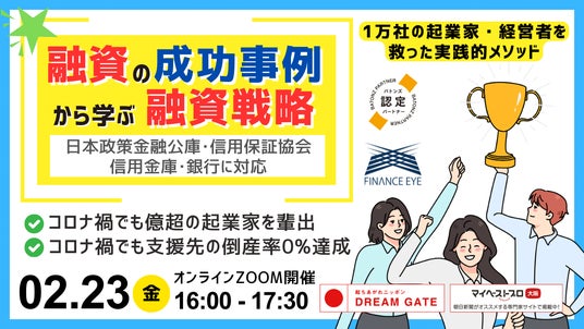 【スモールM&Aもゼロイチ創業の起業も創業融資を活用。成功する経営者が実践する融資戦略123~日本政策金融公庫・信用保証協会付け融資の戦略的活用法】を開催します。1万件以上の起業家や経営者を支援し、コロナ禍でも支援先の倒産率は0%を達成。コロナ禍でも億超えの起業家を創出し続けたファイナンスアイが伝える。開催日時は2024年3月2日(土)16:00にウェビナー形式で開催します。ゼロゼロ融資の返済が始まり回収不能、倒産の増加などの報道が発表されています。これらの状況を背景に、金融機関の融資審査は日々厳しさを増しています。しかし、融資(デットファイナンス)を積極的に使いこなせなければ経営という生存競争に勝ち続けることはできません。M&A起業のメリット・デメリット、ゼロイチ創業のメリット・デメリットから始まり、成功する経営者が実践した融資戦略、失敗する経営者のパターンを伝えます。これから起業する方や既に経営されている方にも、事業を成功させるために自身はどのような融資戦略を描き実現するべきなのか。1万人の起業家や経営者を支援してきたリアルな現場で見た現実の話を交えて皆さんにお伝えします。成功する経営者も失敗する経営者も、最初は普通の真面目な会社員でした。一握りの天才的な英雄でなければ成功できないわけではありません。セミナーを受けた後、アナタのビジネスはファイナンスの力を得て、成功へと躍進することでしょう。