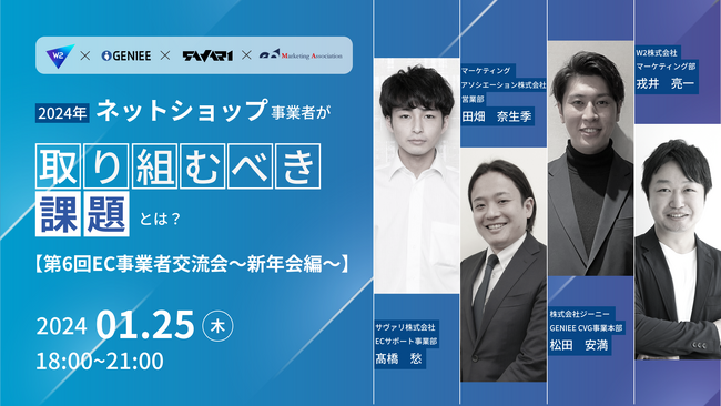 ECサイトの運営代行サービスを提供しているマーケティングアソシエーション株式会社(本社:東京都台東区 代表取締役:中園広和、以下当社)は、2024年1月25日(木)にリアルイベント「2024年、ネットショップ事業者が取り組むべき課題とは? 【第6回EC事業者交流会 ~新年会編~】」を、株式会社ジーニー様、サヴァリ株式会社様、W2株式会社様と共催いたします。
