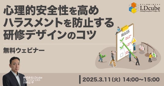 研修のスタイルにとらわれない企業向け人材育成サービスを提供する株式会社LDcube(本社:東京都千代田区、代表取締役社長:新井澄人、以下「当社」)は、昨今関心の高まっており、問い合わせの増えているテーマ「ハラスメント防止」について、「心理的安全性を高めハラスメントを防止する研修デザインのコツ」と題して無料セミナーを開催いたしますので、お知らせします。