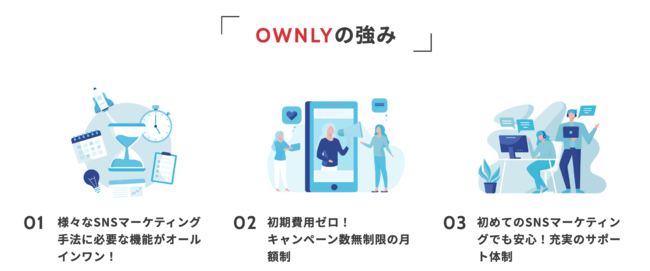 3.初めてのSNSマーケティングでも安心!充実のサポート体制OWNLYは、自社でのSNSマーケティング運用を可能にする、シンプルでわかりやすいユーザーインターフェースを採用しております。