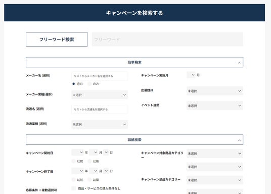 景品・デザイン・応募条件など、詳細条件で抽出可能応募形態(レシート・フォローリポスト・クイズなど)や景品カテゴリ別に絞り込み、競合比較やトレンド把握に役立てられます。