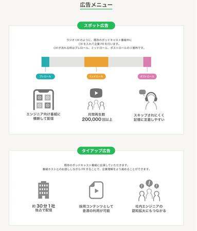 エンジニアリスナー率の高い著名なテック系ポッドキャスト番組に対して、1.音声広告配信、2.番組タイアップ制作・配信を実施するメニューです。