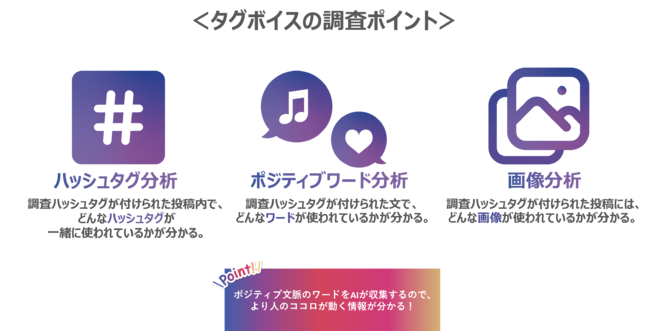 タグボイスでは、アンケートなどの「定量的調査」では知ることが難しく、数値だけでは表しきれない「生活者の興味やトレンドの兆し」を発見することができるので、販促施策のヒントとしてご活用いただけます。