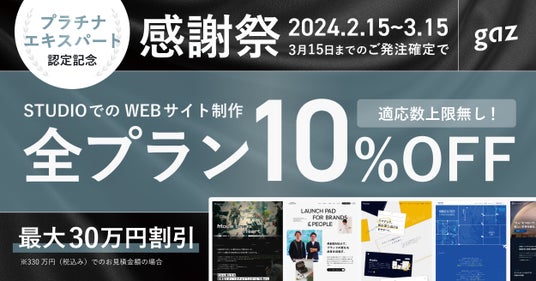 gazがWeb制作のエキスパートが加盟する認定プログラム「STUDIO Experts」の最上位ランクである、プラチナエキスパートにランクアップした記念として、全プラン対象の『Webサイト制作10%OFF感謝祭』を実施いたします。