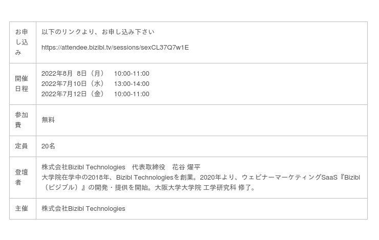 株式会社Bizibl Technologies(本社:大阪市北区、代表取締役:花谷燿平、以下当社)は、『【基礎から応用まで】ウェビナー企画ガイド -完全版-』と題したお役立ちウェビナーを、2022年8月8,10,12日に開催いたします(内容は全て同一です)。