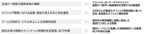 (2)安定・高品質なオフショア運営体制:20年以上の豊富なオフショア開発実績 長年のノウハウを活かしたプロジェクト管理手法や進捗・品質の定量的管理(EVM、品質分析テンプレート)を駆使し、プロジェクトの可視化と安定運営を支援します。