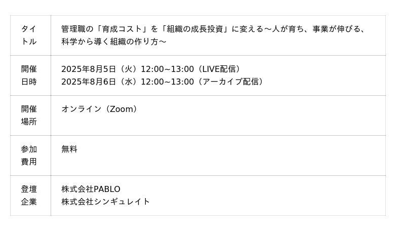 科学とデータの力で組織開発を支援する株式会社シンギュレイト(本社:東京都渋谷区、代表取締役:鹿内 学、以下シンギュレイト)は、株式会社PABLOと共催で『管理職の育成コストを組織の成長投資に変える -人が育ち、事業が伸びる、科学から導く組織の作り方-』を開催します。このセミナーは2025年8月5日(火)12:00~13:00でライブ配信、8月6日(水)12:00~13:00でアーカイブ配信されます。セミナーへの申込みはこちら「管理職の育成」が、事業成長のボトルネックになっていませんか?多くの企業で、プレイングマネジャーが自身の業務に追われ、部下育成まで手が回らないのが実情です。良かれと思って導入した1on1も、いつの間にか「ただの進捗確認」や「気まずい沈黙の場」と化し、形骸化しているケースも少なくありません。