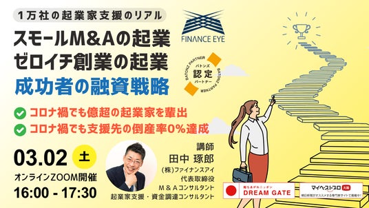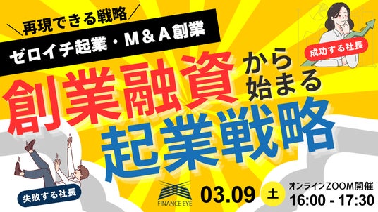 【ゼロイチ起業・スモールM&A個人M&A創業も事業承継も成功と失敗は創業融資の積極活用が分かれ道。日本政策金融公庫・信用保証協会付け融資の戦略的活用法】を開催します。1万件以上の起業家や経営者を支援し、コロナ禍でも支援先の倒産率は0%を達成。コロナ禍でも億超えの起業家を創出し続けたファイナンスアイが伝える。開催日時は2024年3月9日(土)16:00にウェビナー形式で開催します。ゼロゼロ融資の返済が始まり回収不能、倒産の増加などの報道が発表されています。これらの状況を背景に、金融機関の融資審査は日々厳しさを増しています。しかし、融資(デットファイナンス)を積極的に使いこなせなければ経営という生存競争に勝ち続けることはできません。M&A創業のメリット・デメリット、ゼロイチ起業のメリット・デメリットから始まり、成功する経営者が実践している融資戦略、失敗する経営者のパターンを伝えます。これから起業する方や既に経営されている方にも、事業を成功させるために自身はどのような融資戦略を描き実現するべきなのか。1万人の起業家や経営者を支援してきたリアルな現場で見た現実の話を交えて皆さんにお伝えします。成功する経営者も失敗する経営者も、最初は普通の真面目な会社員でした。一握りの天才的な英雄でなければ成功できないわけではありません。セミナーを受けた後、アナタのビジネスはファイナンスの力を得て、成功へと躍進することでしょう。