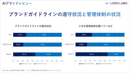 その結果として、約73%の企業がブランドガイドラインを遵守できているとは言えず、また約66%の企業が十分な管理体制・リソースが確保されていないと回答しました。しかし、日経225の企業に限定すると約65%の企業で適切な管理体制が敷かれていることがわかりました。強力なブランドを保有する企業においては、ブランド・ガイドライン遵守のための管理体制は当然のアプローチになっています。(※1)