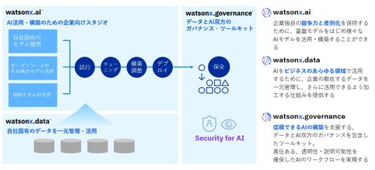 「watsonx」はビジネスに特化したAIとデータのプラットフォームであり、企業がAIモデルの開発、学習、調整、展開を効率的に行えるように設計されています。透明性、責任、ガバナンスを重視した設計により、企業が安心してAIを活用し、持続的なビジネス成長や競争力向上を実現できるよう支援します。