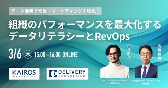 “次の一手“がデータでわかるMA+SFA一体型ツール「Kairos3(カイロススリー)」を提供するカイロスマーケティング株式会社(本社:東京都渋谷区、代表取締役:佐宗 大介)は、株式会社デリバリーコンサルティング(本社:東京都港区、取締役CEO:内藤 秀治郎)との共催セミナー「データ活用で営業・マーケティングを強化!組織のパフォーマンスを最大化するデータリテラシーとRevOps」を開催することをお知らせします。