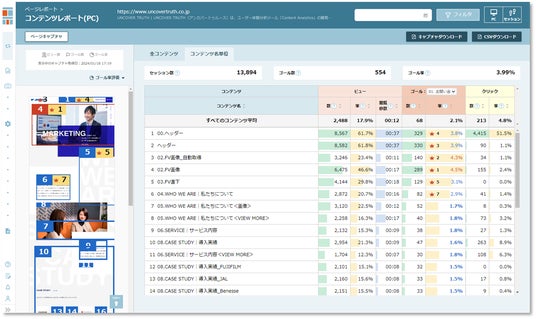 UNCOVER TRUTHが提供する『Content Analytics(コンテンツアナリティクス)』についてコンテンツアナリティクスは、一般的なWeb解析ツールのように、Webページ単位での成果を数値化するだけではなく、Webページ内のテキストや画像(=コンテンツ)単位での成果を数値化し、評価分析が出来るツールです。ユーザーの行動ログデータを収集することで、ユーザーが見ているテキストや画像(=コンテンツ)の内容から、ユーザー単位での嗜好性や興味関心といった定性的な情報まで数値化することも可能になります。これらのデータを元に、一人ひとりのユーザーと最適なコミュニケーションを図るためのCRMにもご活用いただけます。