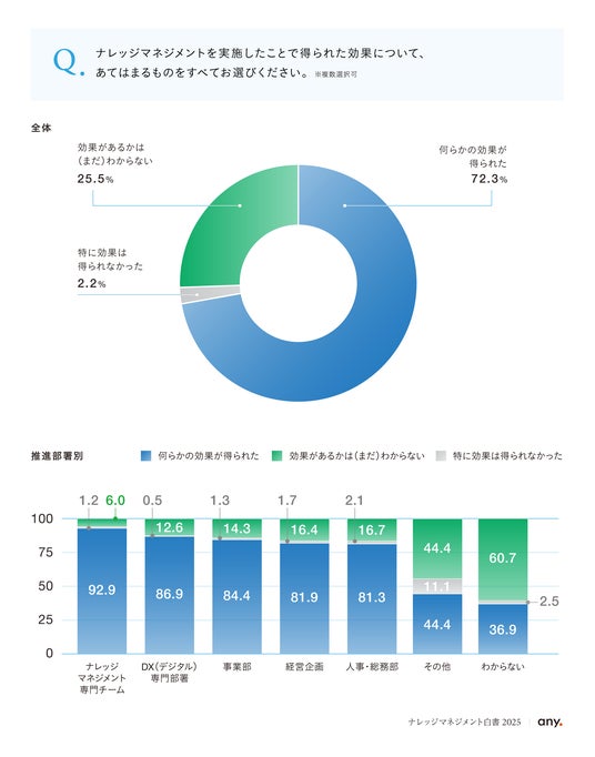 特にナレッジマネジメント専任チームが組成されている組織で効果が得られやすいことは明らかだが、DX専門部署がDXの取り組みと併せてナレッジマネジメントを実施することも成功の近道と考えられる。