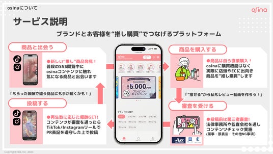 ■「osina(オシナ)」についてosinaはブランドとお客様を“推し”でつなげるプラットフォームです。ユーザーはosinaに掲載されている商品の中から、愛用品や気になる商品を購入しSNSに動画を投稿。ユーザーは投稿した動画の再生数によって報酬を得ることができます。ブランド様にとっては、一般的な「インフルエンサー」ではなく、一般消費者層の愛用者 = ファンによるFGC (Fan Generated Contents) を大量に、効率よく創出できます。