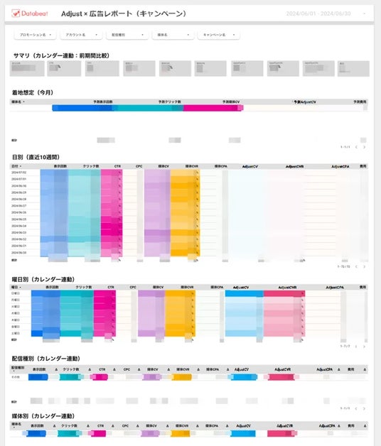 Adjustを利用すれば、モバイルアプリのパフォーマンスを正確に把握し、マーケティングの改善に役立てることができます。■Adjust連携広告レポート作成ツールとはAdjust連携広告レポート作成ツールは、Databeatで自動収集・蓄積したWEB広告データとAdjustで計測したイベントデータを掛け合わせたLooker Studioレポートを作成できる「Databeat」オリジナルのツールです。本ツールはDatabeatの「
