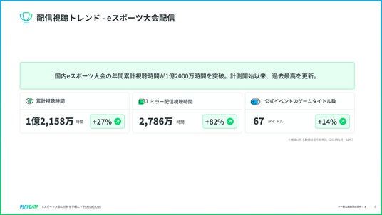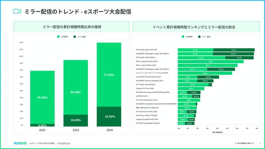 株式会社プレイブレーン(本社所在地:東京都品川区 以下、プレイブレーン)は、eスポーツ配信データ分析サービス「PLAYDATA」通じて計測されたデータを基に、2024年1月1日から12月31日の期間における国内eスポーツ大会配信の年間トレンドレポートの無料配布を開始しました。