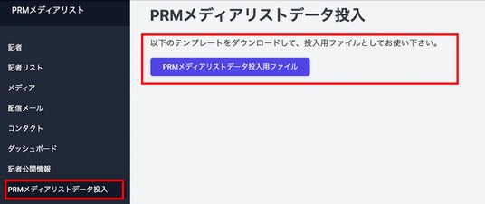 プロネにログイン後、「PRMメディアリスト」に入り「PRMメディアリストデータ投入」をクリックすると「データ投入画面」が開きます。以下の手順にてデータ投入を完了すると、自社でつながる記者たちに効果的なリリース送付や記者データの一元管理ができるようになります。
