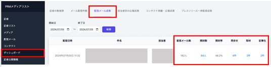 2)新機能「配信メール成果」について- 自社のメディアリストへ個別メール配信した結果が確認可能(開封率や、どの記者がいつ開封したかなど)自社の記者リストをPRMメディアリストにアップロード後、「配信メール」機能で簡単にプレスリリースが個別メール送信することができます。結果は「PRMメディアリスト」の内の「ダッシュボード」ページにて確認可能です。