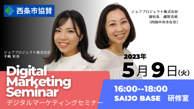 ハタラクをつくる、楽にする、楽しむソリューションを提供するジョブプロジェクト株式会社(本社:東京都新宿区、代表取締役:鈴木 貴大 https://job-project.com/ 以下、ジョブプロ)は、この度、「西条市協賛<西条チャレンジ!デジタル改革応援> デジタルマーケティングセミナー」と題し、愛媛県西条市SAIJO BASEにて2023年5月9日(火)16:00より開催いたします。