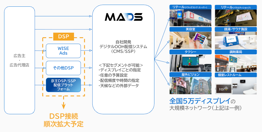 本接続により、京王DSP/SSP配信プラットフォーム経由で、MADSネットワーク内の各ロケーションへ広告配信が可能となります。これによりMADSは、各ロケーションオーナーに対する広告マネタイズ支援をさらに拡大し、運用負荷を抑えながら収益機会の最大化に寄与します。京王エージェンシーは、従来の交通メディア・屋外メディアに加え、リテールメディアをはじめとした新たな媒体への配信が可能となり、ターゲットの生活導線に沿った、シームレスな広告接触が可能になります。