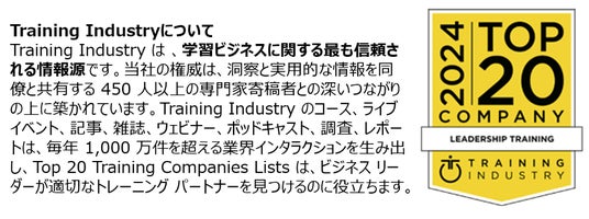 - 「人的資本管理のアカデミー賞」と言われるBrandon Hall Group の Excellence in Technology Awardで金賞を受賞、Training Industry社のグローバルトップクラスのリーダーシップトレーニングプロバイダーの1社として選出されるなど世界的に高い評価を得ている