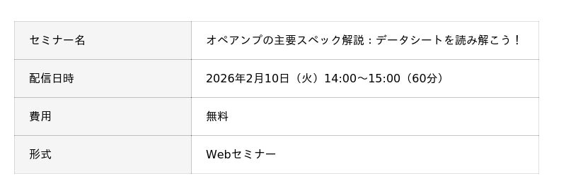 エレクトロニクス商社の丸文株式会社(代表取締役社長 兼 CEO / COO︓堀越裕史、本社: 東京都中央区、以下、丸文)は、2月10日(火)にアナログ設計の成功を左右するオペアンプの主要スペックを解説する無料のオンラインセミナーを開催します。