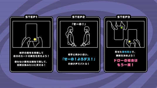 【「AI転生ビジネスカードバトル!よろしくデスマッチ!」とは】ビジネスマンの武器である顔と名刺・・・。これらの情報のみでAIがあなたをキャラクターに変身させ、その場でトレーディングカードにするAI生成エンターテインメントコンテンツです。キャラクターにはそれぞれ「炎:リーダーシップ (Leadership)」「水:クリエイティビティ (Creativity)」「地:ストラテジー (Strategy)」「雷:テクニカル (Technical)」「草:コミュニケーション (Communication)」の属性が名刺や顔情報から与えられ、その属性を使ってキャラクター同士カードバトルさせて楽しむことができます。掛け声は・・・「せーの!よろデス!」