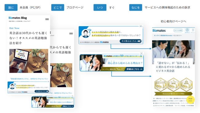英語学習やフレーズなどのキーワードで検索してオウンドメディアに来る潜在層の方は、記事内で目的のフレーズや情報を拾えたら帰ってしまいます。「そもそも何から学習したら良いかわからない」「英語学習にコンプレックスがある」などと感じている初心者に対して、記事テーマに合わせたポップアップで不安を払拭することにより、無料会員の登録促進をしています。例えば、英語の学習法を検索したユーザーに対して「まずは日常会話から始めるべきではないでしょうか?」とお声がけをするポップアップを表示して、サービスサイトへ誘導する施策を実施しています。