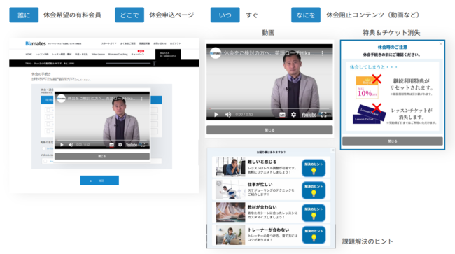 休会率を下げるために、休会申し込みページでは動画などを用いた有料会員の離脱防止施策を実施しています。オンラインで1人で学習されている方には、感情に訴えるメッセージが有効なため、休会申し込みページでは、ビジネス英語コーチHika(ビズメイツ(株) 取締役 伊藤日加氏)が「こうしたら課題をクリアできませんか?」「もう少しがんばりましょう!」とエモーショナルな励ましをする動画を流しています。結果、休会率が従来の91%となり9%の改善効果が出ました。また、休会すると会員で受けられていた特典がなくなることを訴求するシナリオでは10%以上の成果が出ています。