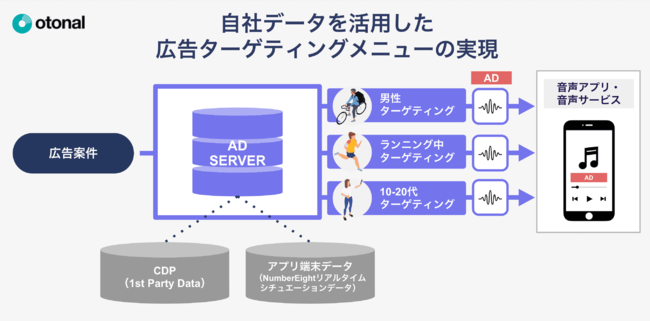 オトナルでは、過去、複数の大手メディア企業のデータ基盤構築・運用を行っており、そのノウハウを活かした、1stパーティデータ活用による音声アプリ、音声サービスのための音声広告メニューの実現が可能です。