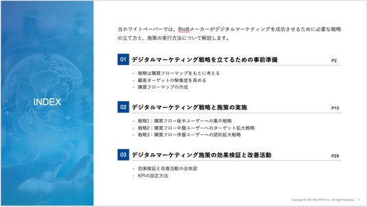製造業向けのWebマーケティングサービスを提供する、テクノポート株式会社(本社:東京都港区、代表取締役:徳山 正康)は、製造業のWebマーケティングを成功させるためのノウハウを掲載したダウンロード資料を、メーカーと受託加工業向けにそれぞれ作成し無料公開しました。