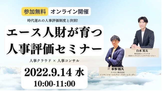 人事評価と目標管理の「スマカン」を提供するスマカン株式会社(本社:東京都品川区、代表取締役:唐沢雄三郎)は、人事評価制度のコンサルティングを実施する株式会社エックスラボ(本社:大阪市北区、代表取締役:藤勝行)と共同で『エース人財が育つ人事評価セミナー』を2022年9月14日(水)にオンラインにて開催いたします。