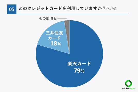 ■クレカ積立に利用するカードは「楽天カード」が圧倒的人気「Q5-1. (クレカ積立を利用している方のみ回答)どのクレジットカードを利用していますか?(各種カードはゴールドカード等の種類も含む)」という問いに対して、最も多かった回答は、「楽天カード」79%でした。次いで、「三井住友カード」18%となっています。