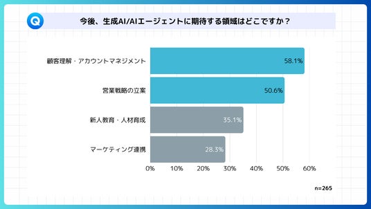 生成AI/AIエージェントに期待する領域として、「顧客理解・アカウントマネジメント」(58.1%)、「営業戦略の立案」(50.6%)が上位に。