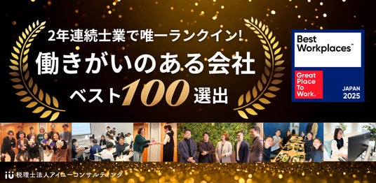 全国11拠点で中小企業・資産家向けに各種サービスを展開するアイユーコンサルティンググループ(東京都豊島区、代表:岩永 悠/副代表:出川 裕基)の母体組織である税理士法人アイユーコンサルティング(以下当社)はこの度、Great Place to Work(R) Institute Japan(以下GPTW(R))が認定する「働きがいのある企業 2025年版」において、士業で唯一ベスト100に選ばれました。