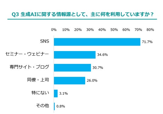 生成AIに関する情報源として、最も多かったのが「SNS」で、71.7%を占めていました。次いで、「セミナー・ウェビナー」が34.6%、「専門サイト・ブログ」が30.7%という結果となりました。