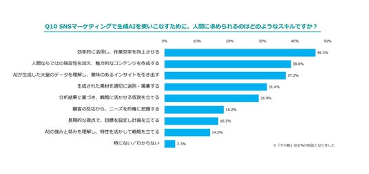 また生成AIの利用に関して、著作権などの権利の侵害や出力結果に対する懸念が伺えました。不特定多数に発信するSNS運用で活用するからこそ、権利侵害には十分に注意する必要があるのでしょう。生成AIのSNSマーケティング活用が広まってきた中で、生成AIを用いながらいかにして周りとの差を作るかという点でも、人間ならではの独自性を加えるスキルというのは重要だと考えられます。