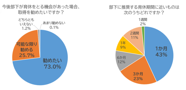 「部下に育休を勧めたい・可能な限り勧めたい」との回答が98.7%、「育休の推奨取得期間は一か月以上を推奨」が87%など高評価となりました。