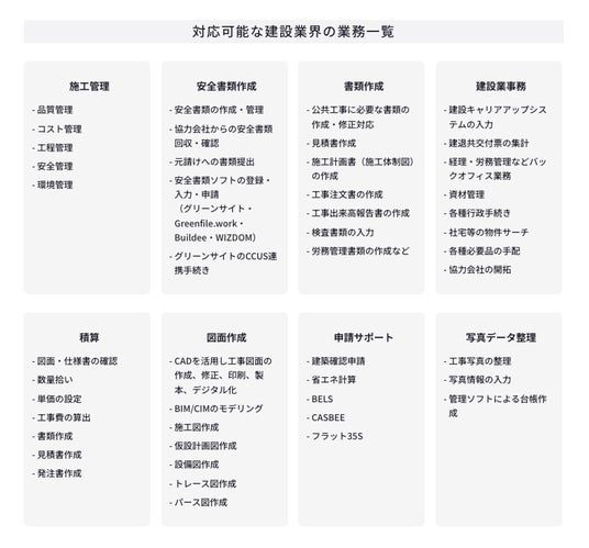 書類作成から施工管理・図面作成まで、さまざまな業務を建設業界経験者が代行させていただいております。対応可能な業務例は以下の通りです。
