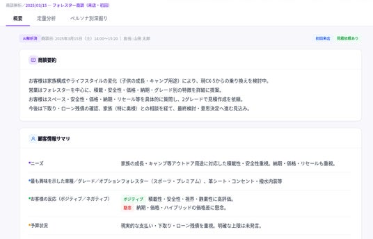 店長がすべての商談に同席できず、指導が後追いになりがち セールスの報告だけでは、お客様の“温度感”や迷い、具体的な要望が十分に共有されにくい 良い接客・対話が属人化し、再現・横展開が難しい