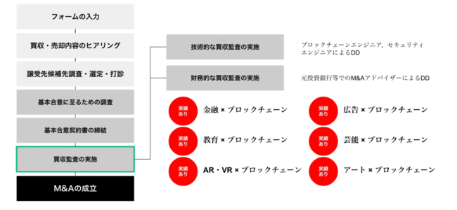 M&A経験のある金融の専門家と技術DD(デューデリジェンス)が可能なブロックチェーンの専門家がアドバイザーを務め、企業の技術・ノウハウ・トークンの価値を算定します。また、複数領域での開発実績のあるエンジニアによる技術的なDDを行うことにより、適切なマッチングを行うことが可能です。